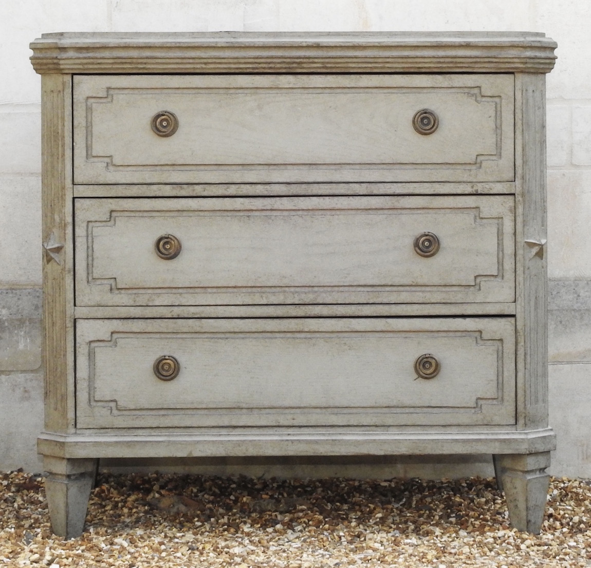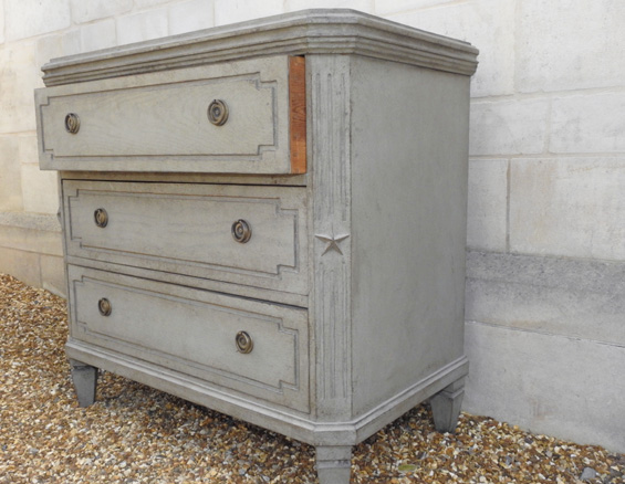 A Pair of Painted Three Drawer Swedish Chests standing on small Tapered Feet. The top has a Decorative Moulded Frieze sitting above 3 Panelled Front Drawers with Reeded Canted Corners with Applied Star Motif.